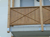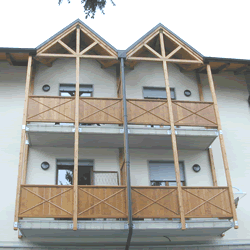 Parapetto balconi formato da montanti in abete lamellare di mm 100 x 100, - tavole verticali battentate di abete, - corrimano incassato nella cornice superiore; - disegno a forma di "X" con listoncini triangolari;