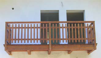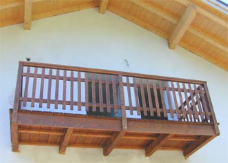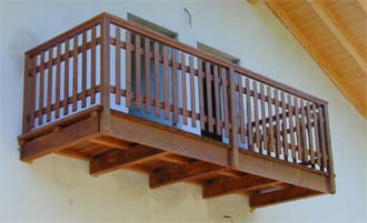 Pavimento poggiolo in larice formato da n° 3 travetti di mm 60x80 posati trasversalmente e parzialmente incassati nei modioni; - sovrastanti tavole di mm 150x40; - parapetto formato da montanti di sostegno di mm 70x90; - tavole verticali di mm 60x20 fissate ai traversi di mm 40x70; - corrimano di mm 95x45 incassato nei montanti; - mantovana coprimodioni.
