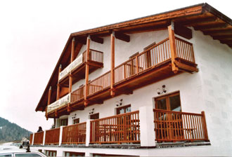 Parapetto tipo "TRENTO" in larice con supporti in ferro zincati alle travi del tetto, - montanti di supporto di mm 140x140, - pavimento formato da travetti trasversali e tavole di mm 40 posizionate longitudinalmente ai travetti.