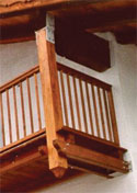 Particolare poggiolo con sostegno pavimento formato da due tavole di mm 60x120 fissate al montante con barre filettate e alla parete con piastra in ferro zincata.