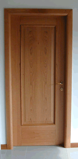 Porta Mod. "B1" in ciliegio americano, telaio e mostrine coprofilo raggiati in legno massello, mostrine coprifilo di mm 35 x 90, una specchiatura bugnata.