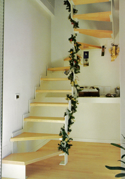 Scala a giorno in larice massiccio con spessore di mm 40, struttura portante esterno gradino in ferro, sagomato.