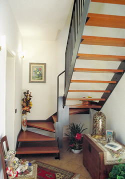 Scala a giorno con gradini in faggio massiccio con spessore di mm 40, struttura portante esterno gradino in ferro, parapetto con capiscala con diametro di mm 32 e colonnine con diametro di mm 20.