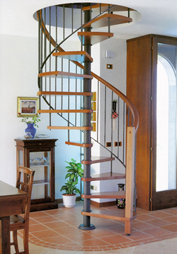 Scala a chiocciola con supporto centrale di mm 100, gradini in faggio massiccio con spessore di mm 40, caposcala di mm 70 x 70, corrimano elicoidale di mm 50 x 45, colonnine verticali in ferro battuto di mm 16 x 16.